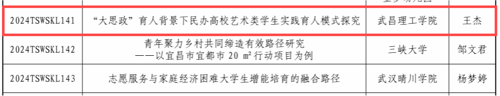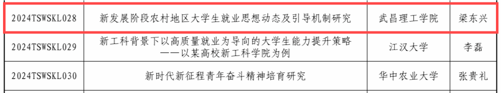 (特约记者 齐欢欢报道)近日,共青团湖北省委及湖北省社会科学界联合会下发《关于2024年度湖北省共青团和青少年工作研究课题立项的通知》,中国·ok138太阳集团梁东兴博士申报的《新发展阶段农村地区大学生就业思想动态及引导机制研究》(立项编号:2024TSWSKL028)获批立项。这是我校首次获批此类项目。