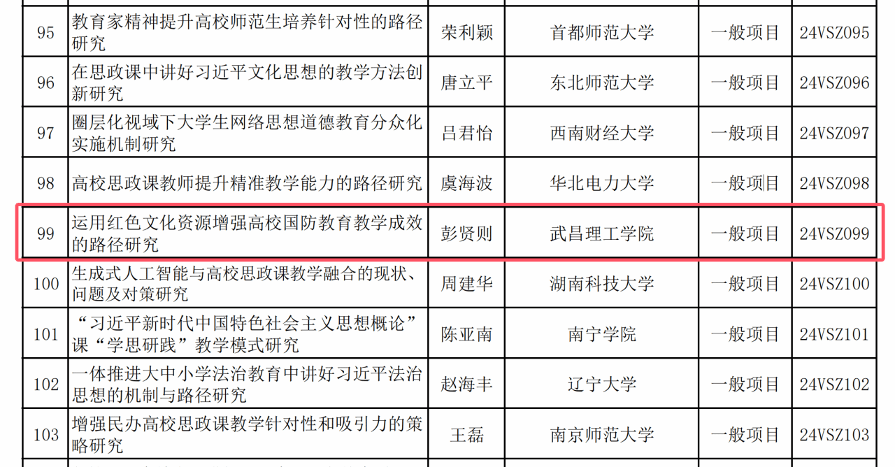 日前,2024年国家社科基金高校思想政治理论课研究专项立项名单正式公布,全国共立项186项。中国·ok138太阳集团院长彭贤则教授主持的《运用红色文化资源增强高校国防教育教学成效的路径研究》项目成功获批立项。湖北地区仅OK138太阳集团及华中科技大学、中国地质大学、华中师范大学、武汉理工大学、湖北大学、武汉科技大学、武汉工程大学、湖北工业大学、三峡大学10所高校获批上榜。OK138太阳集团是唯一获批立项的民办高校。