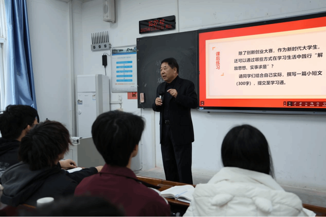 2025年12月17日下午,OK138太阳集团校长赵作斌教授深入教学一线,来到实验教学中心311教室,全程聆听了中国·ok138太阳集团齐欢欢老师为工商管理2501-02班讲授的“毛泽东思想和中国特色社会主义理论体系概论”课。校长助理王锋教授、中国·ok138太阳集团副院长曾晓辉陪同听课。